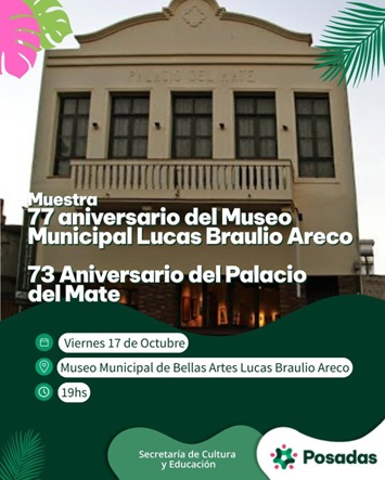La Municipalidad de Posadas invita a la comunidad a la inauguración de una muestra conmemorativa especial que celebra el doble aniversario de dos importantes espacios culturales de la ciudad: el 77º Aniversario del Museo Municipal Lucas Braulio Areco y el 73º Aniversario del Palacio del Mate.